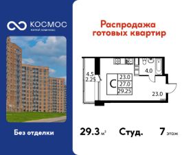 Продаётся студия в сданном доме (Корпус 3), срок сдачи: 2-кв. 2025, общей площадью 29.25 кв.м., на 7 этаже. ЖК ''Космос'' - новое место для жизни, в котором сочетаются отличная экология, удобное расположение, креативные решения архитектуры и функциональные планировки квартир. Строительство жилого комплекса ведётся при проектном финансировании Сбербанка. ЖК ''Космос'' расположен в микрорайоне Авиационный (Домодедово), в 24 километрах от МКАД по Каширскому шоссе.Проект будет состоять из 7 корпусов высотой 12 этажей. На первых этажах домов запланировано открытие необходимых для жителей объектов торговой и социальной инфраструктуры, в том числе магазинов, кафе, медицинского центра. В микрорайоне Авиационный также есть всё необходимое для комфортной жизни - здесь находятся детские сады, школы, высшие учебные заведения, магазины, поликлиники и медицинские центры, спортивный клуб, ТЦ ''Торговый город''. Помимо этого, жители ЖК ''Космос'' смогут пользоваться развитой инфраструктурой г.о. Домодедово - до него можно добраться за 20 минут на автомобиле или электричке.Одна из особенностей ЖК ''Космос'' - отличное экологическое состояние локации. В 10 минутах ходьбы от комплекса находится благоустроенный парк ''Взлёт'' с красивым прудом Лесным, здесь планируется дальнейшее благоустройство территории. Рядом с ''Космосом'', на площади Гагарина, будут проходить городские мероприятия.Проект отличается удобной транспортной доступностью - до МКАД можно добраться за 20-25 минут. Около жилого комплекса находятся остановки общественного транспорта, в пешей доступности - ж/д станция ''Авиационная'' Павелецкого направления.На придомовой территории ЖК ''Космос'' предусмотрено устройство парковочных мест численностью 544 машино-места, в том числе для маломобильных групп населения.