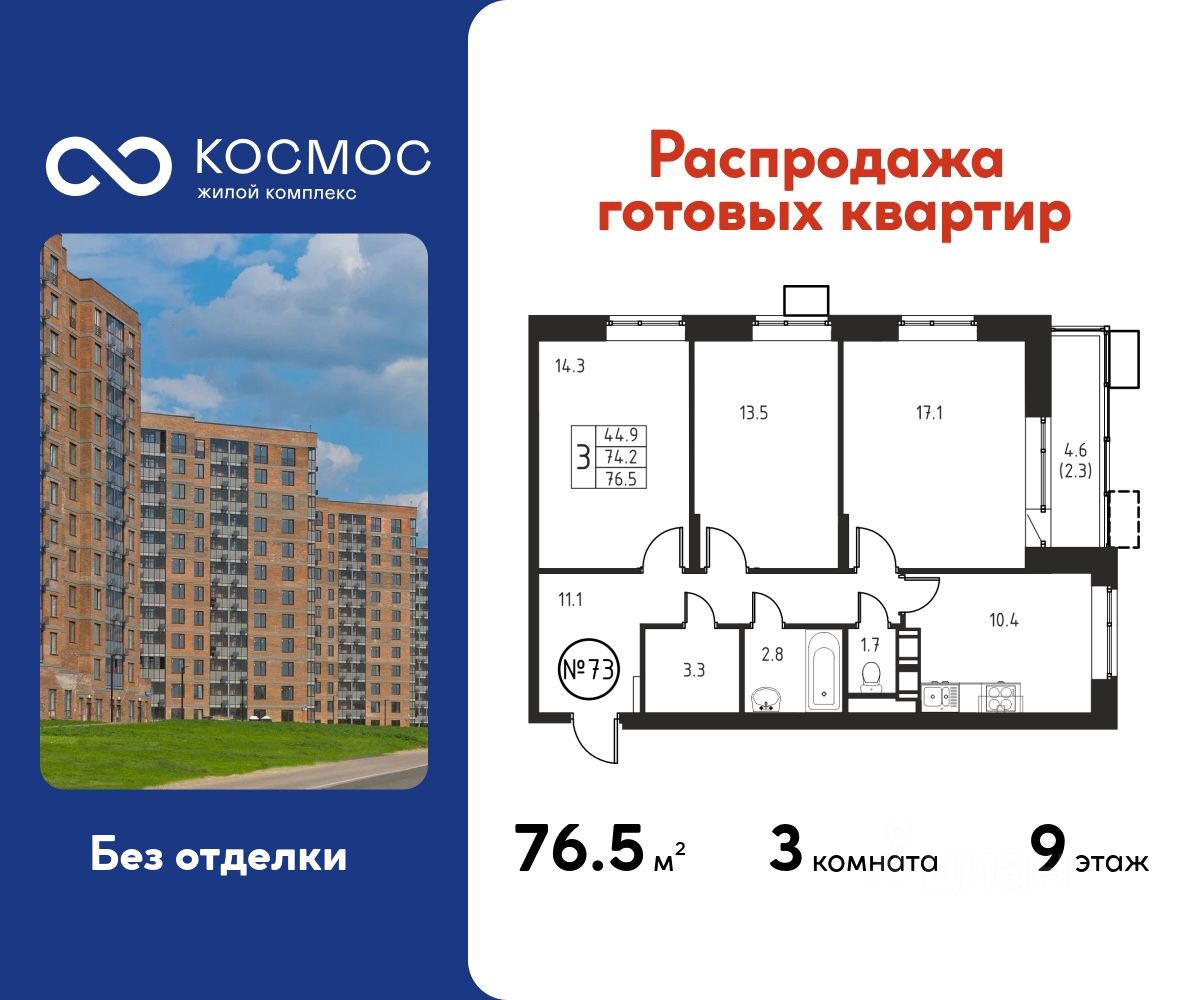 Продаётся 3-комнатная квартира в сданном доме (Корпус 6), срок сдачи: 2-кв. 2025, общей площадью 76.50 кв.м., на 9 этаже.