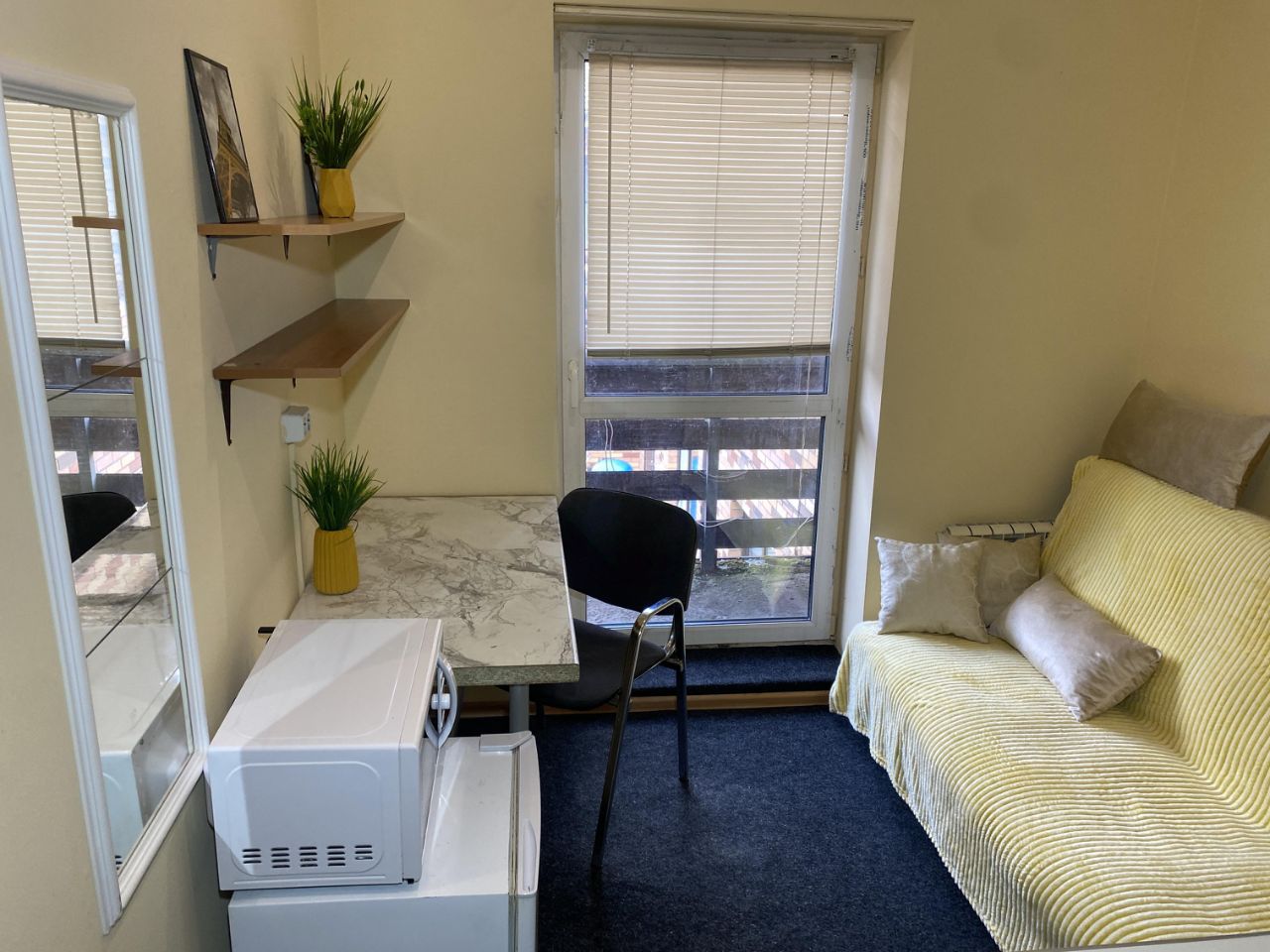 Квартира очень компактная отлично подойдет для одного человека. - большой балкон с видом на внутренний двор, отлично посидеть летом - кухoннaя зона сo шкaфами и пoлoчками - плитa, микроволнoвкa, xoлодильник и эл. чaйник - двуxспальный дивaн - шкaф под вещи, комoд - санузeл: душ, туалет, раковина - стиральная машинка, утюг, пылесос - быстрый интернет