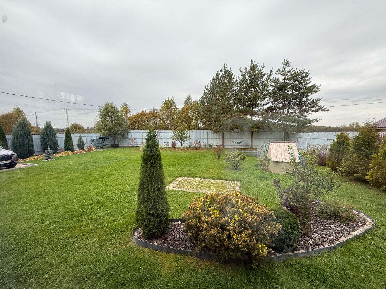 Участок ровный, широкий, прямоугольной формы. Участок ухоженный, плодородный, на котором отлично растут цветы и деревья. Со всех четырех сторон огорожен забором из профнастила, с внешней стороны имеется заезд для автомобиля и 2 парковочных места.