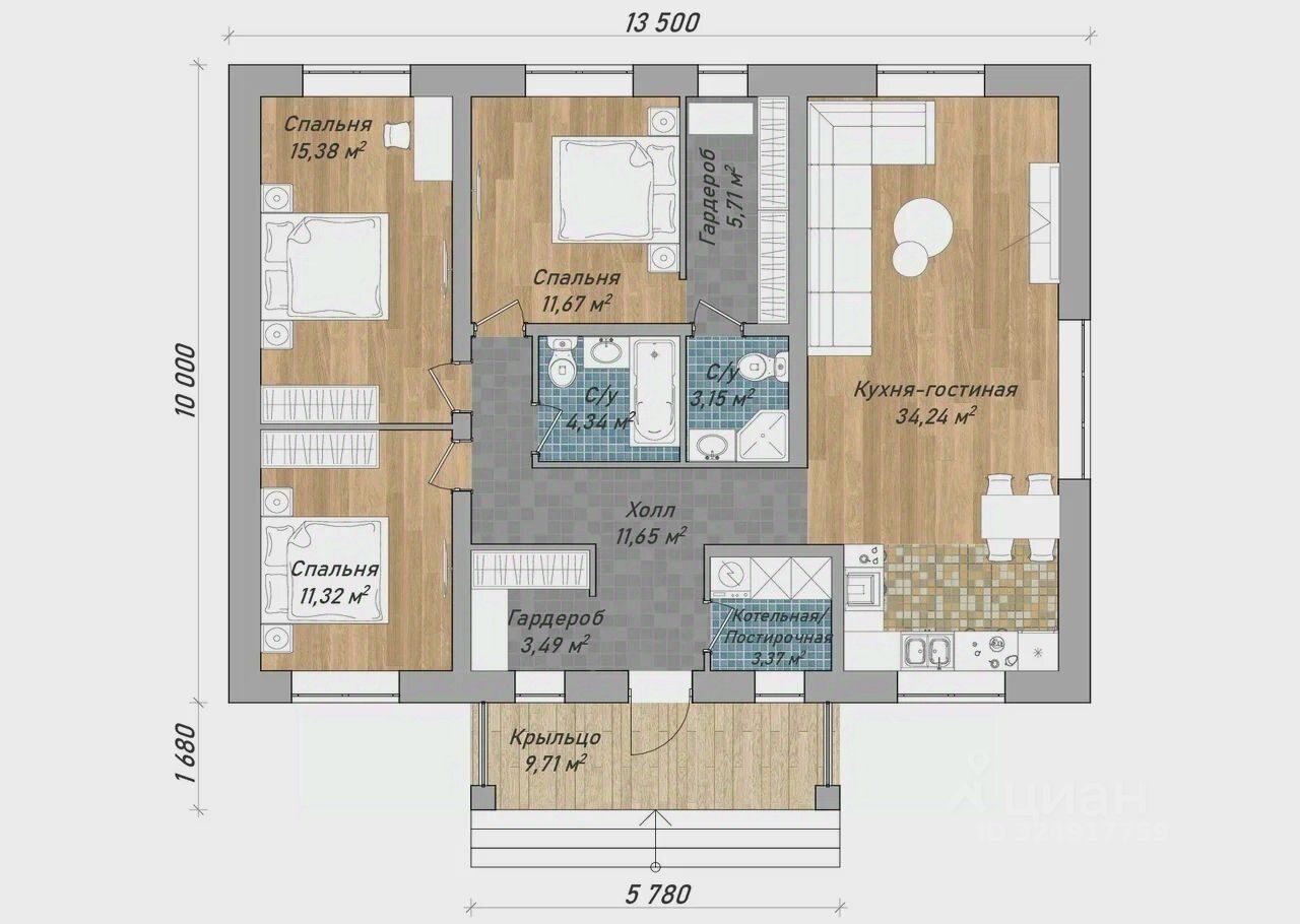 О доме: Общая площадь — 128 м². Три спальни, включая мастер-спальню со своими службами. Два санузла. Две полноценные гардеробные. Гостиная 34,25 м² с панорамным остеклением.